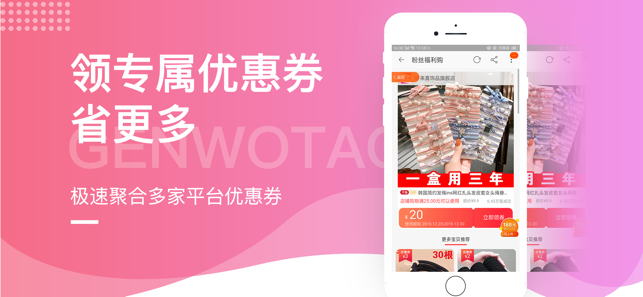 跟我淘app让你购物更省钱的平台,现在很多人都喜欢网购,今天分享给大家的这个购物平台就别错过了,这里的商品种类很多,很丰富,每天都有优惠券分享给你领取,购物之前记得先领取优惠券,这样下单直接就可以少钱了,比平台在线下购物要方便很多,所有商品都是包邮发货,带给你更加愉快的购物体验,喜欢购物的你别错过了,欢迎广大用户下载使用。