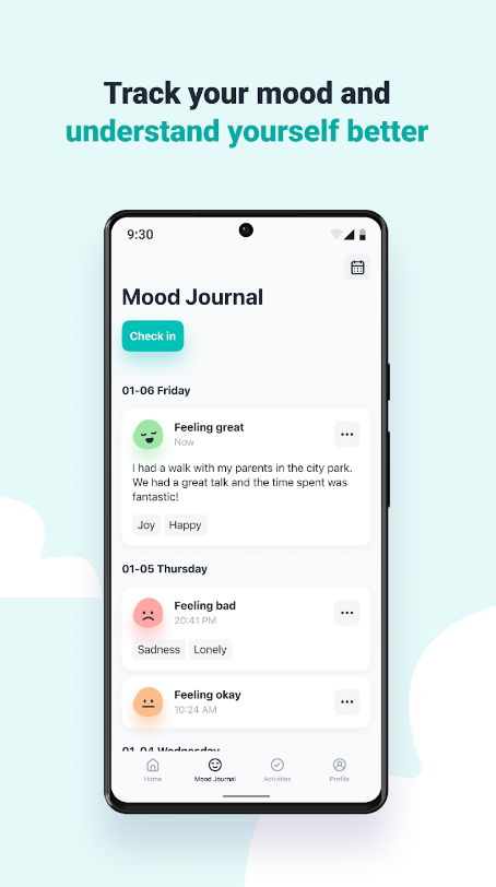 The app also provides a mood journal that allows you to track your mood and explore your emotional well-being through journaling. With daily mood tracking, you can identify emotional triggers and behavioral patterns, which ultimately helps you take control of your feelings and improve your mental health.