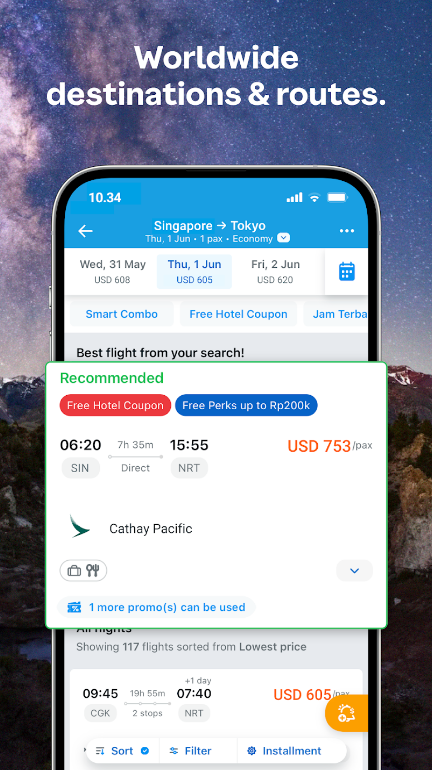3、Flights: Traveloka offers more than 100,000 flight routes from a wider range of reputable airlines, including Singapore Airlines, Scoot, Jetstar, AirAsia, Malaysia Airlines, Emirates, Etihad, Qatar Airways, and other international airlines, allowing you to find the best flight promo every day.