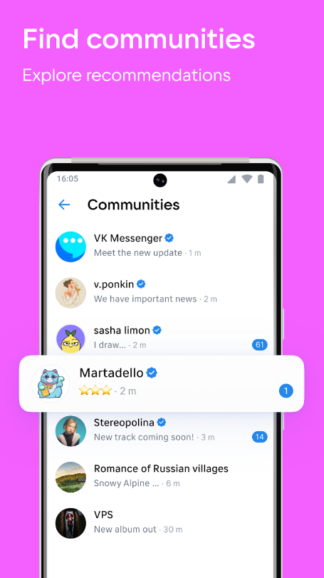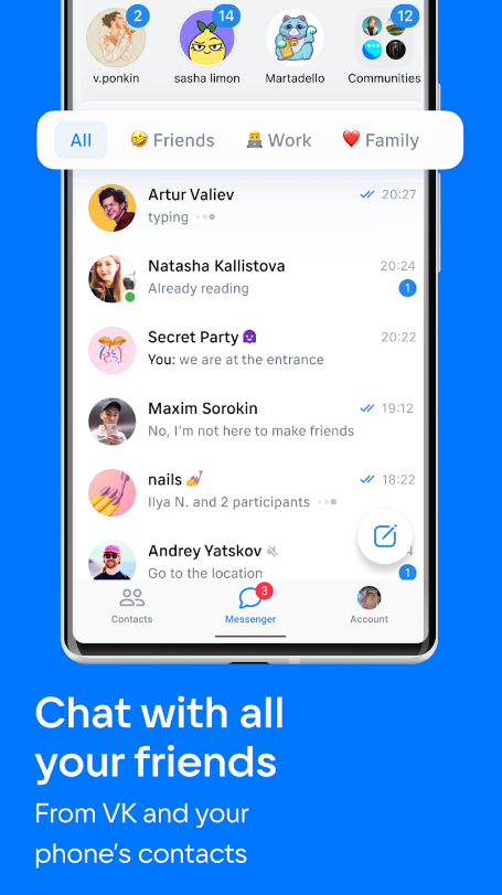 2、Easy contact access: Users can easily access their VK and phone contacts within the app, making it easy to connect with people. The app also allows users to add contacts from their phone and message anyone they have exchanged numbers with.