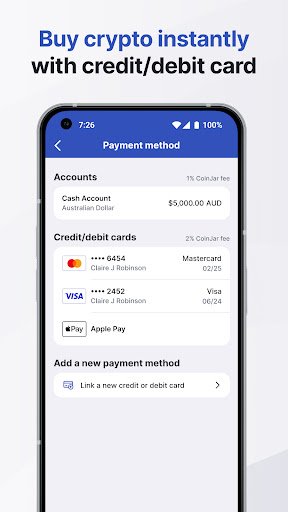 1、With CoinJar, you can buy cryptocurrency instantly using Google Pay, a credit or debit Card with only a 2% convenience fee. Compared to other exchanges, CoinJar has some of the cheapest credit card purchase fees in the world.