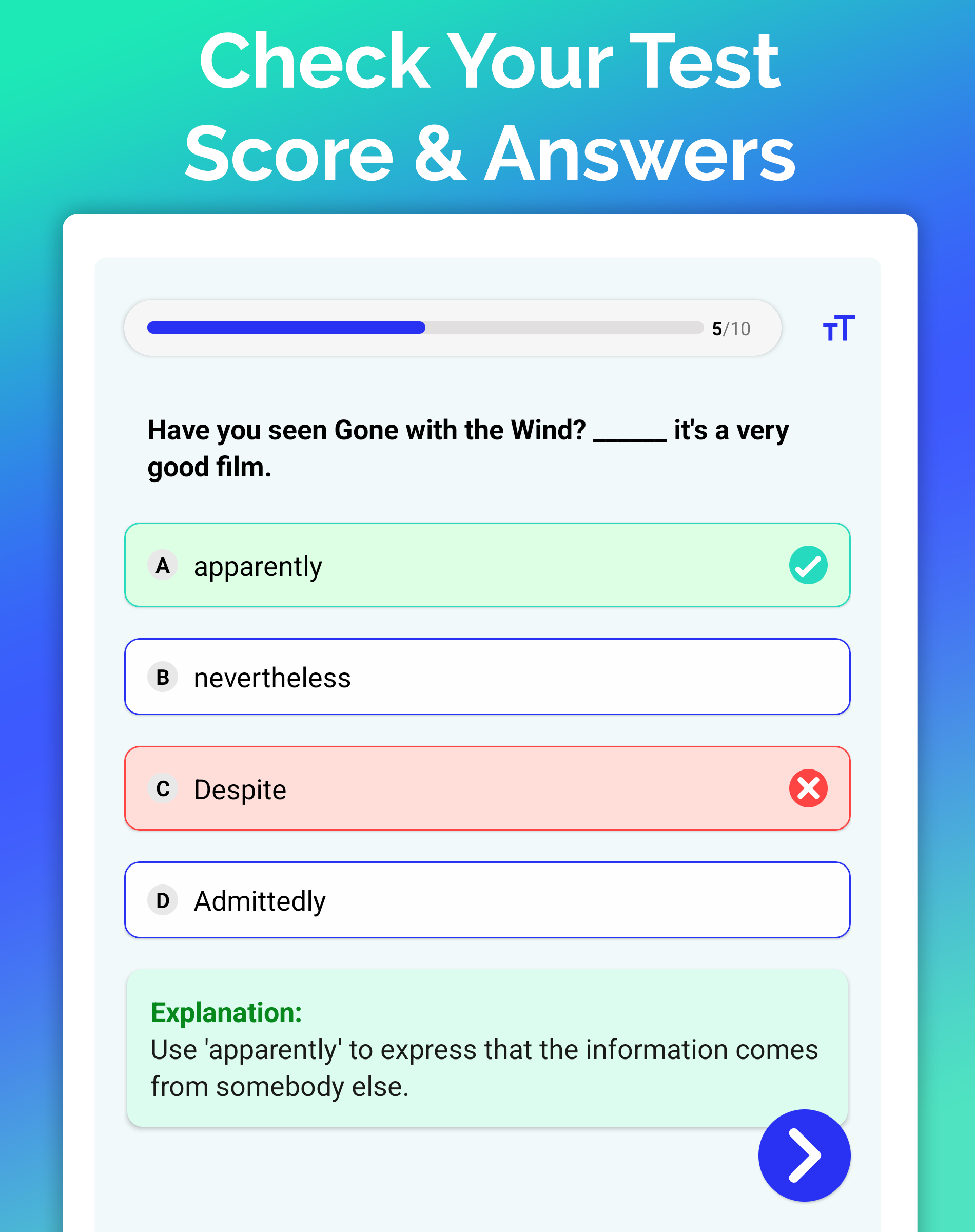 The extensive collection of 200+ grammar lessons and 10,000 questions is designed systematically to progressively reinforce your skills. Upon completing your English test, you will receive insights into your strong areas and aspects needing further attention. This resource also prepares you for standardized tests like IELTS, TOEFL, SAT, MCAT, LSAT, GMAT, and GRE.