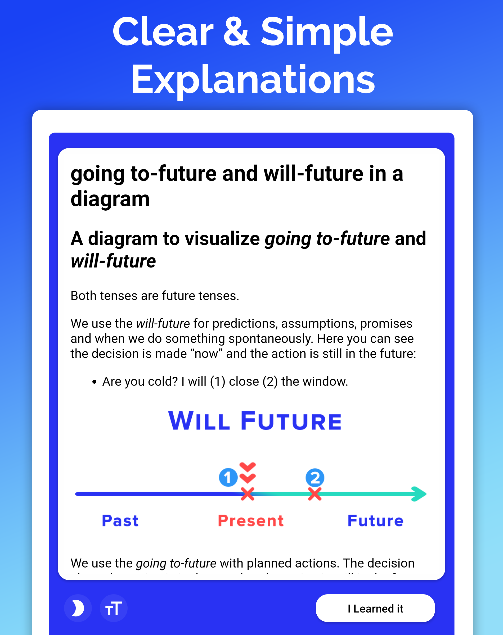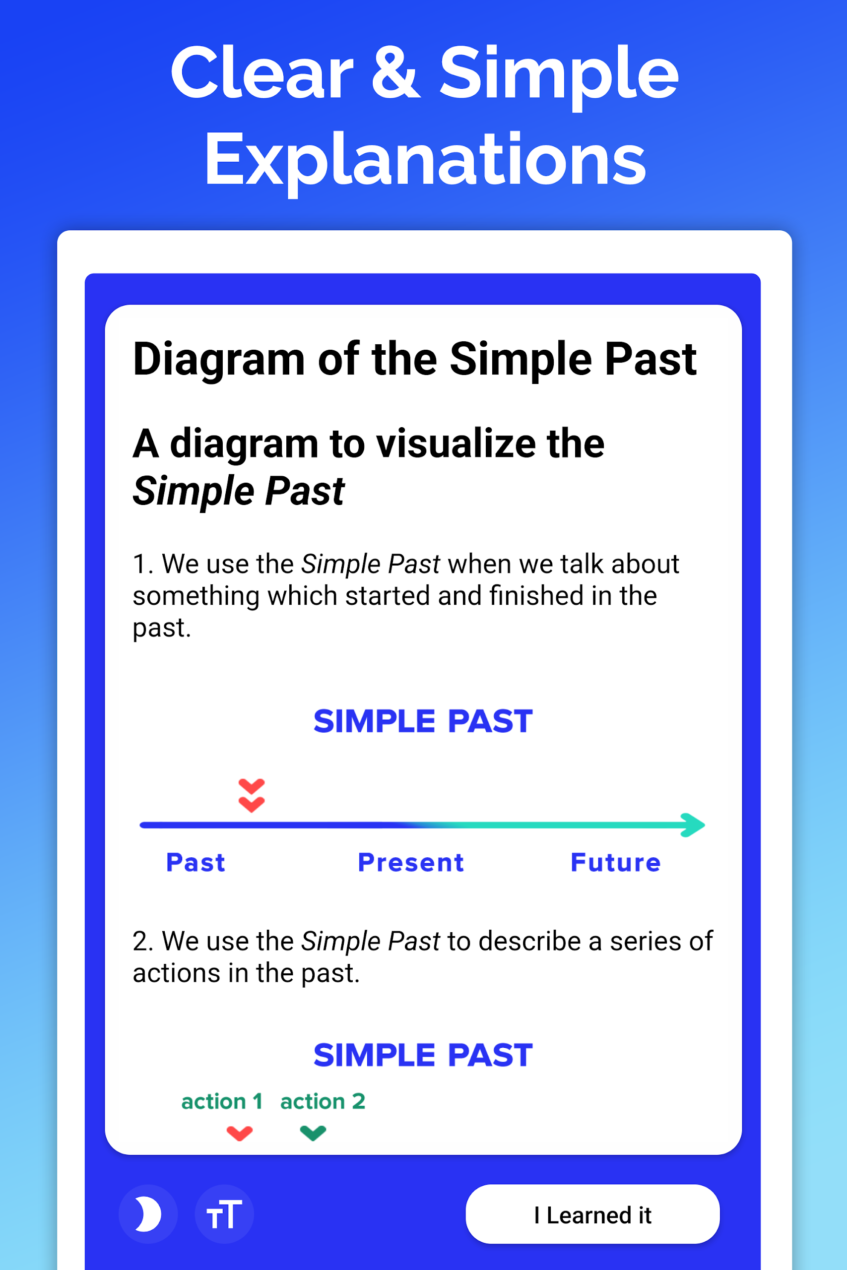 English showcases its fascinating depth through the variety of tenses used daily by speakers. Gaining familiarity with these tense distinctions equips individuals with the ability to apply them suitably in different contexts. This application is structured to facilitate understanding by Organizing numerous lessons dedicated to the various tenses encountered in English.