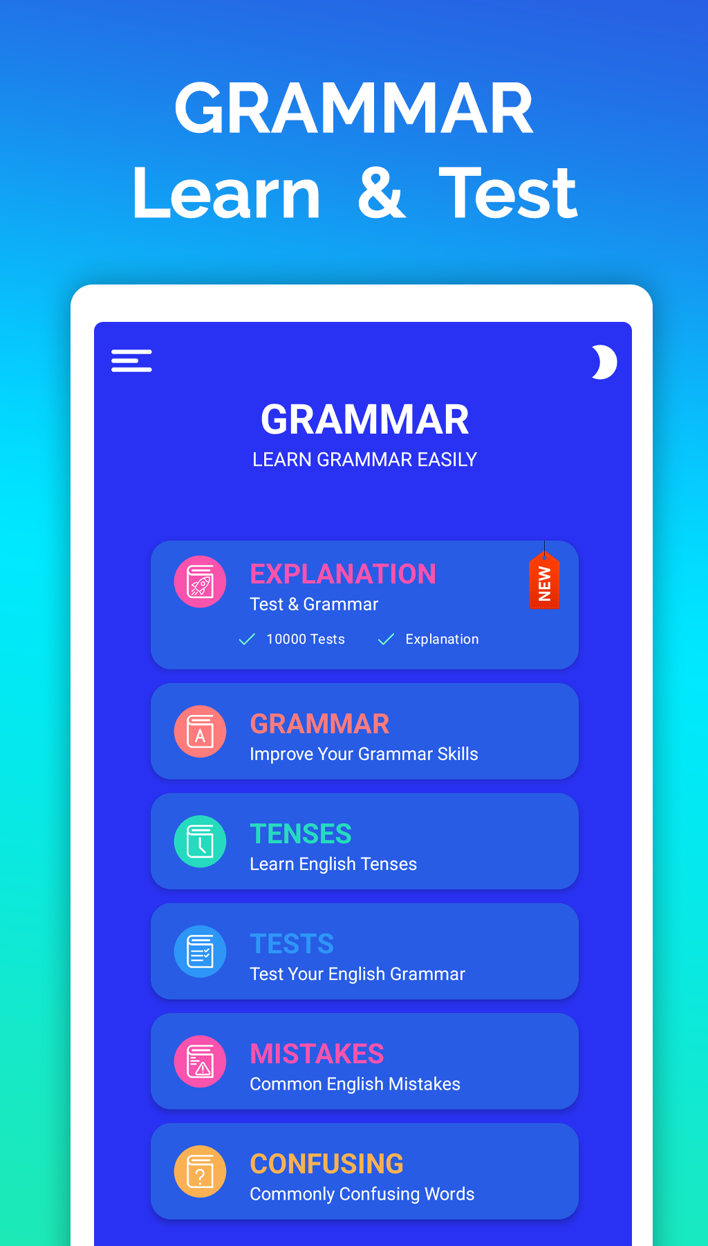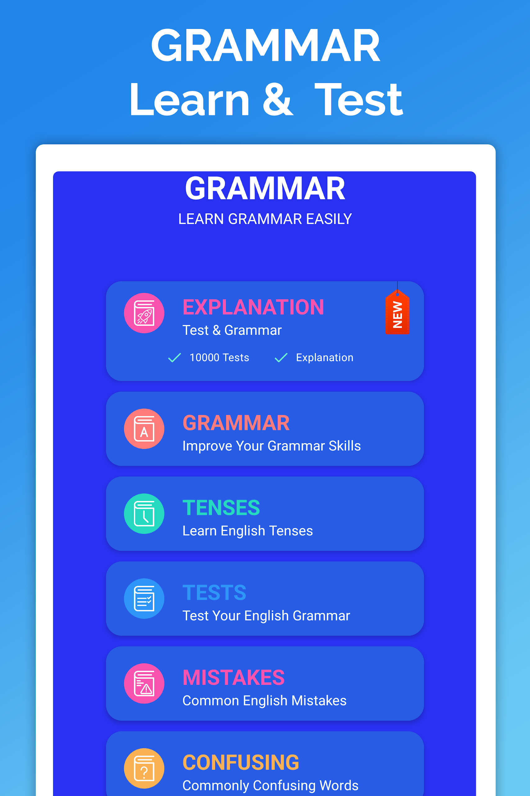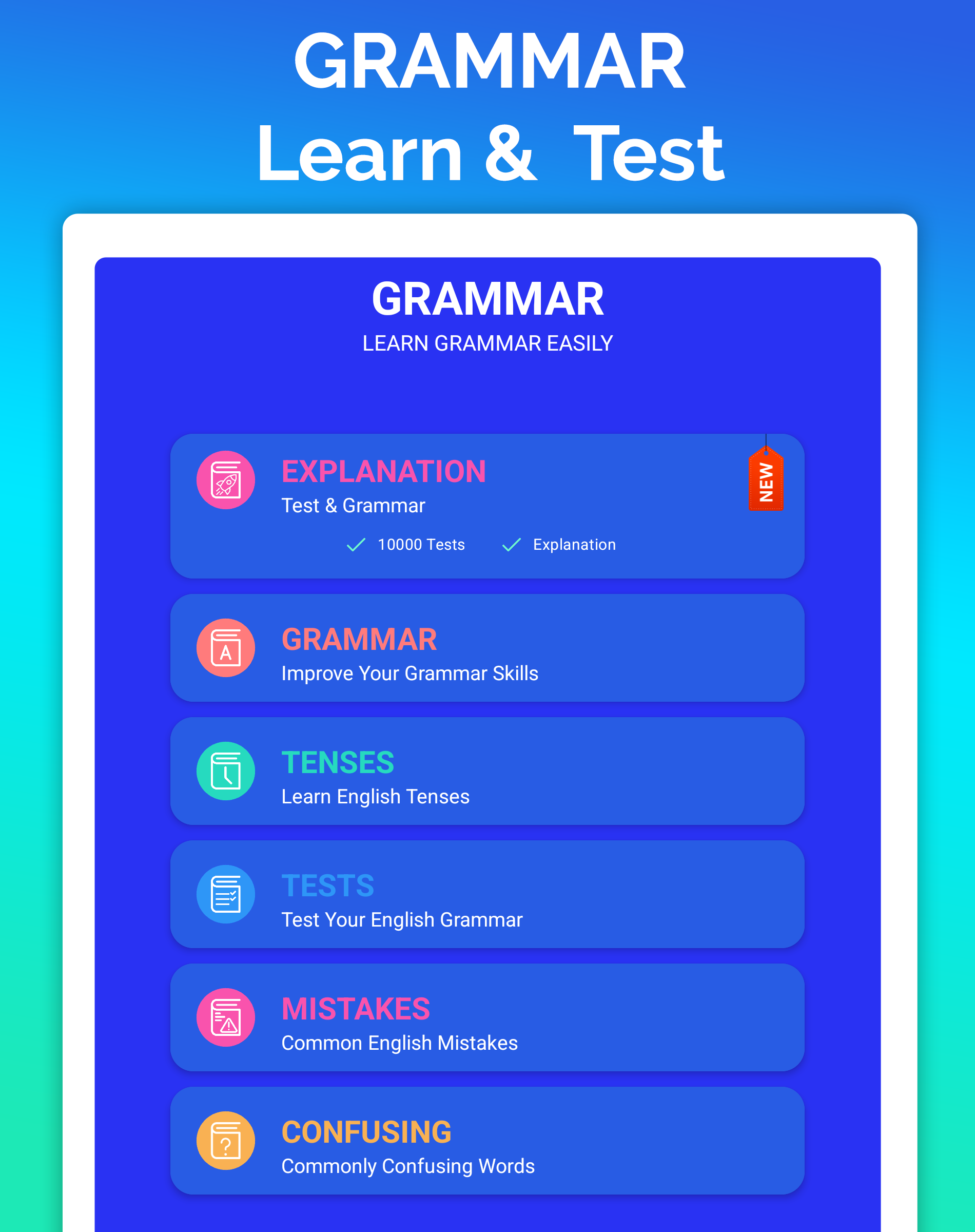 Main topics explored within the English Grammar app encompass: