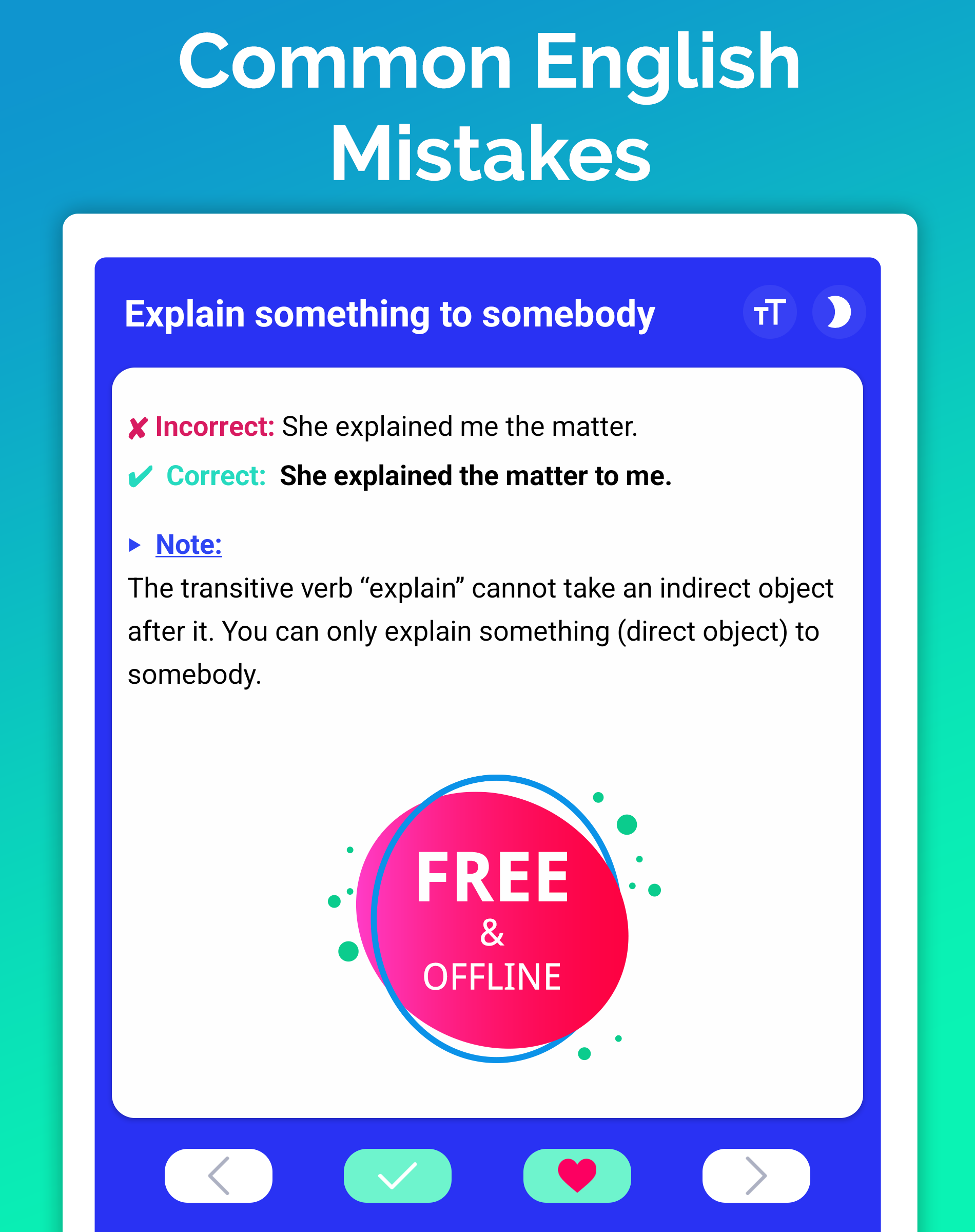 Given the widespread use of English, numerous common errors tend to surface when individuals communicate publicly or in various contexts. Luckily, the application includes a specific category aimed at assisting users in identifying their mistakes or modifying their approach to using English in order to minimize these frequent errors.