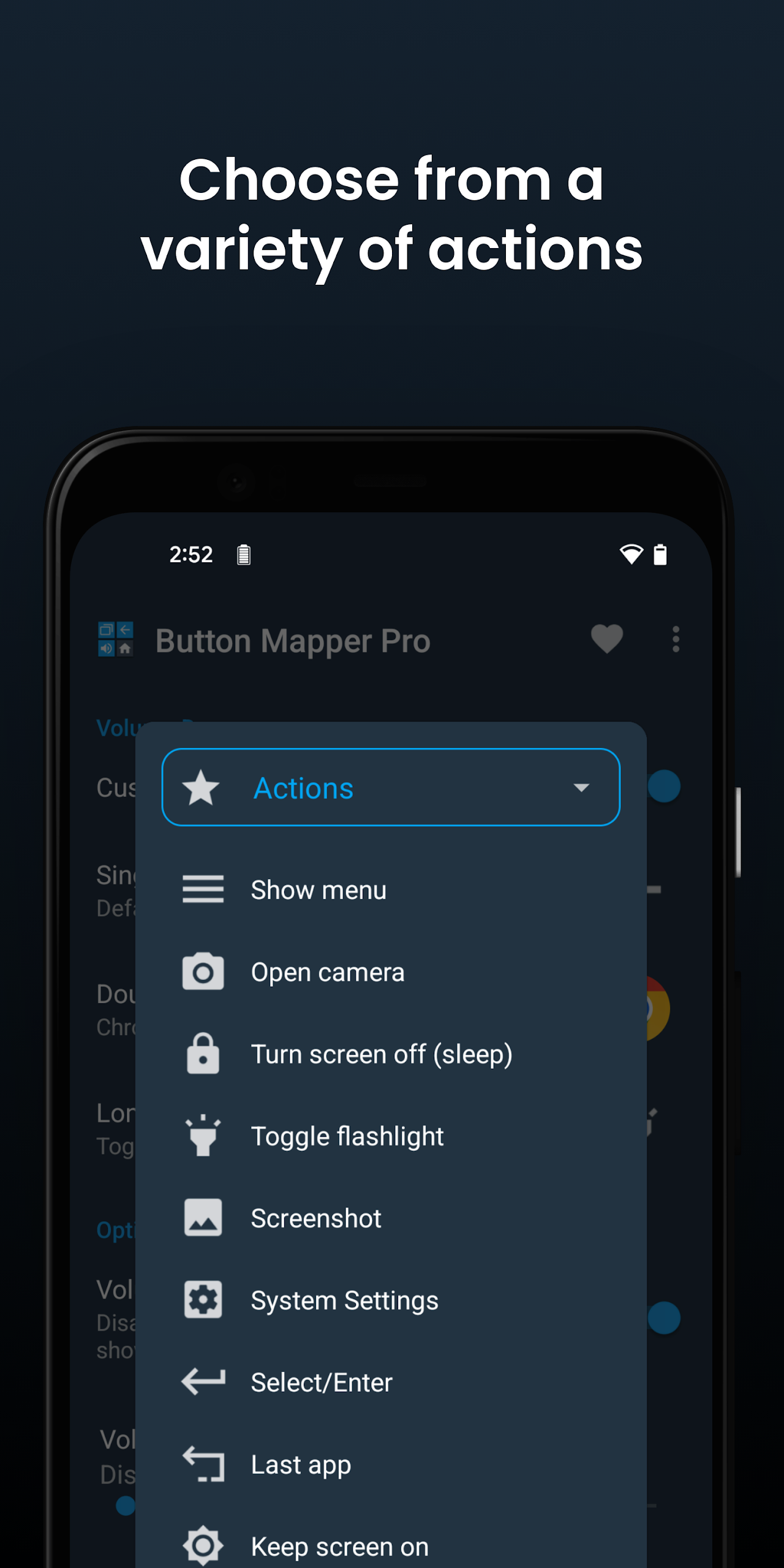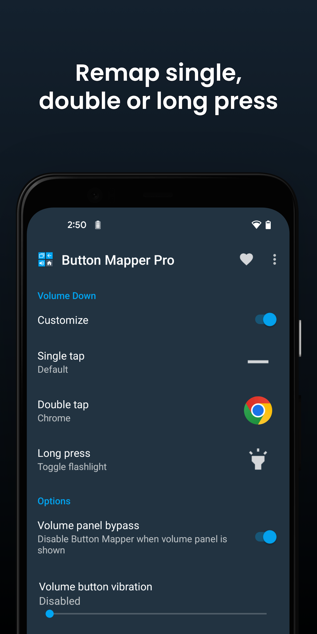 - Fine-tune button behavior by choosing to bypass Button Mapper while the camera, phone, or system UI is displayed.
