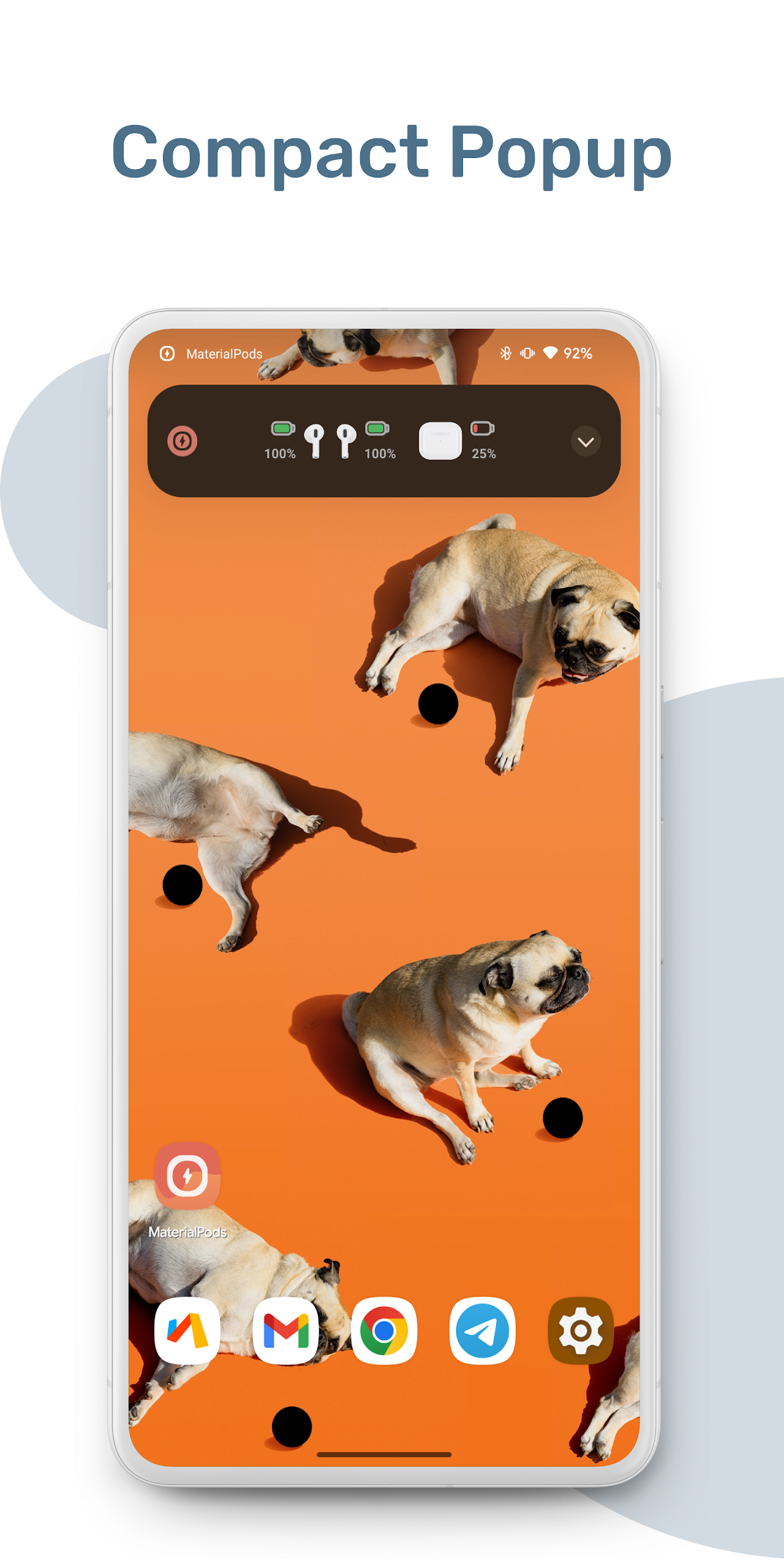 You will never be surprised by a low AirPod battery again! With MaterialPods, you receive timely battery notifications directly on your screen. It's akin to having your AirPods gently informing you about their remaining battery Life, though not in Words—but you understand the concept.