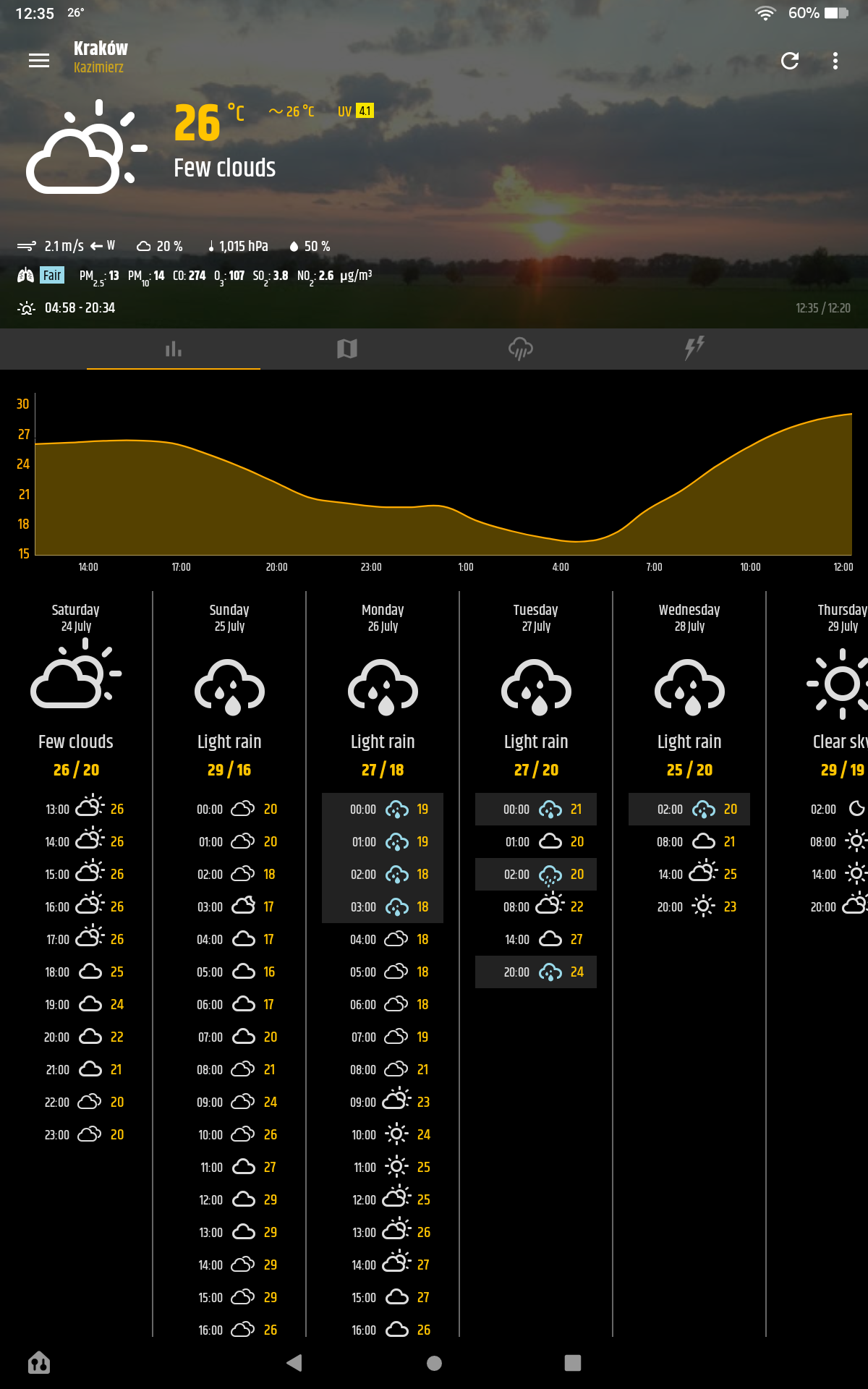 Simple Weather & Clock Widget is adept at delivering accurate information regarding both weather conditions and time for your current location or anywhere around the globe. This application will let users know when outdoor temperatures are likely to fall, if rain is expected, how windy it might get, or when the sun will set. Using informative charts and icons, Simple Weather & Clock Widget offers the most precise and comprehensive representation of the weather fluctuations, covering aspects such as temperature, precipitation, air humidity, and wind speed. Additionally, it informs the user whether their intended destination is experiencing day or night and provides the current time there.