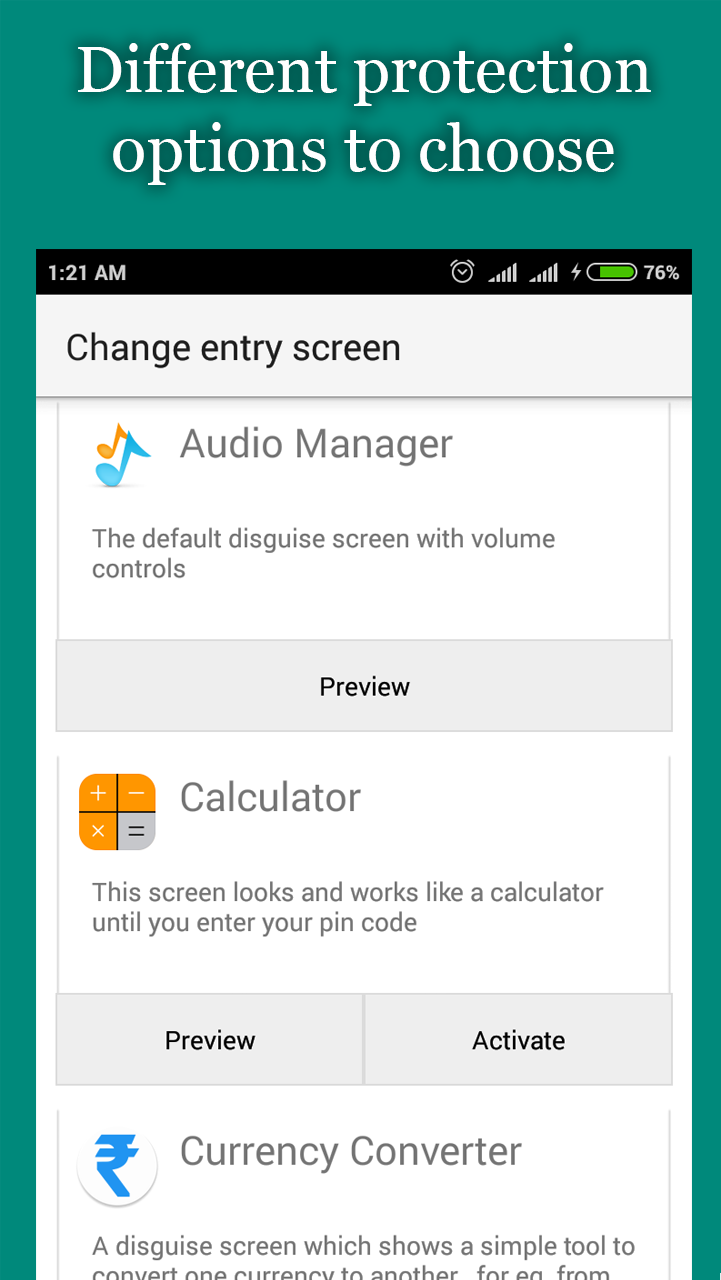 1.) The app masquerades as an effective Audio Manager (various disguises such as Calculator are also provided)