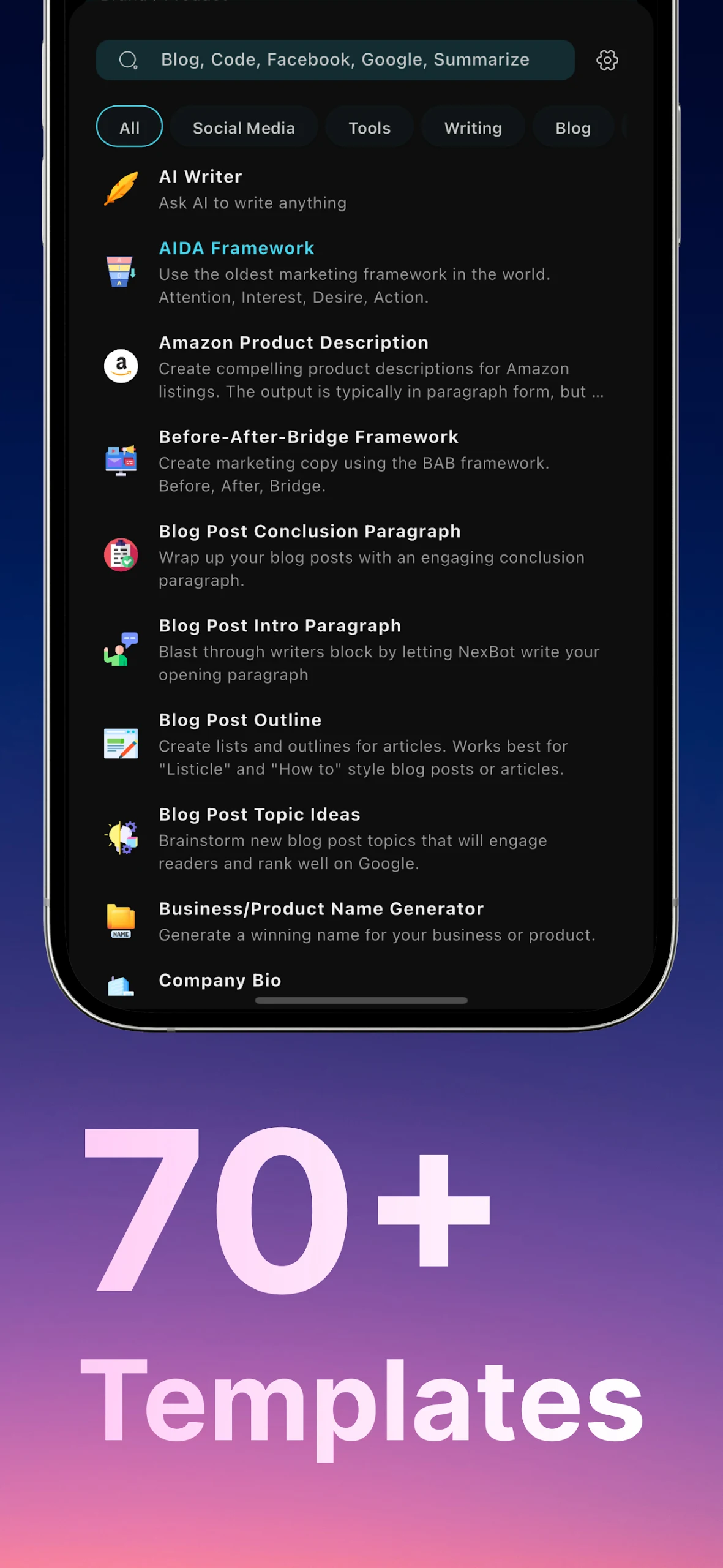 Different Social media platforms require distinct types of post formats. As a tech application, AI Writer Copilot: NexBot Chat offers a wide range of content options to meet user needs. The application generates various types of content that cater to both Short and long formats across nearly all platforms.