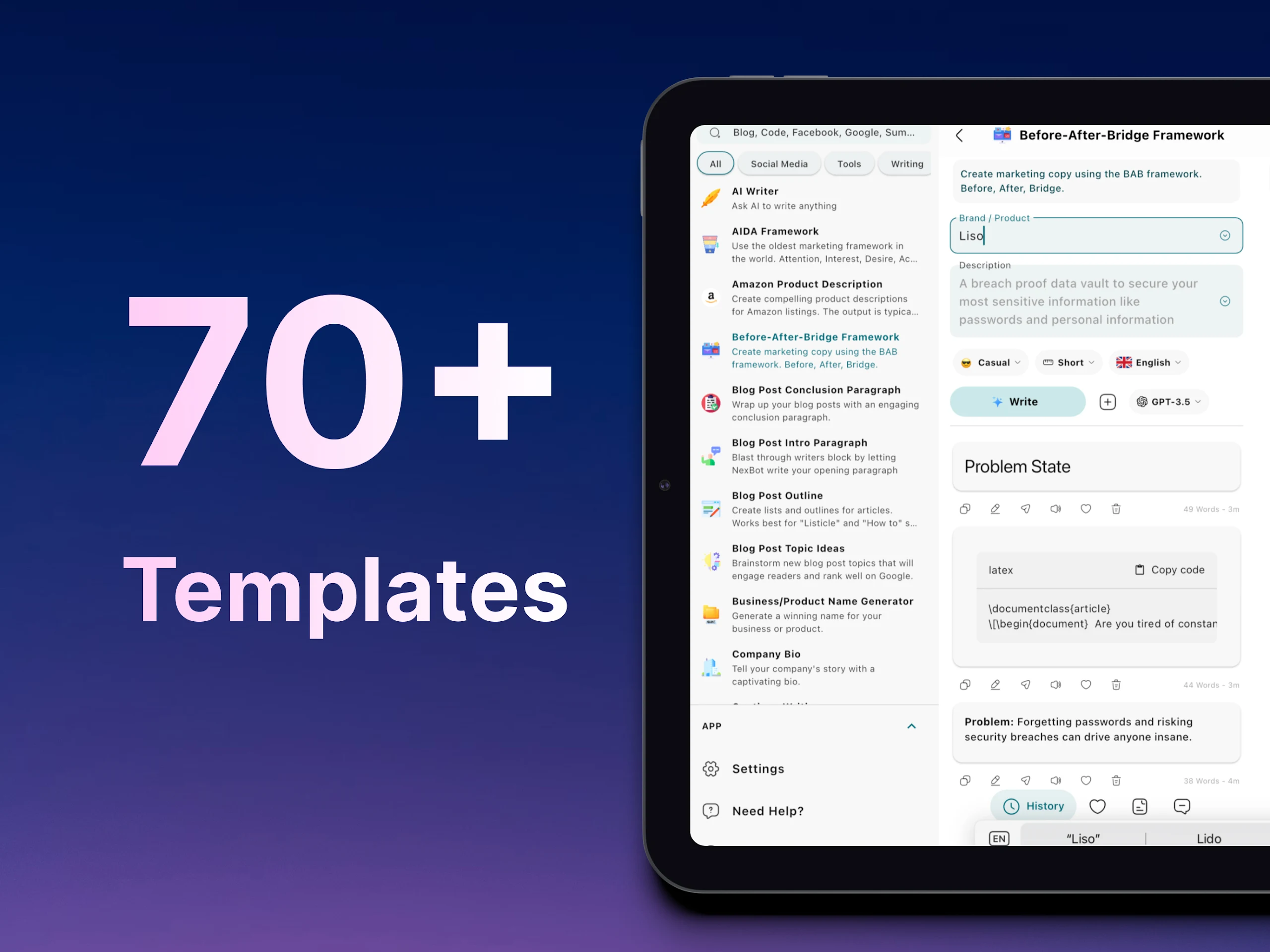 Customizable Templates: Think that writing doesn’t have ready-made templates? Think again! With numerous social media platforms, applying the correct formatting for your content increases your chances of going viral significantly. The application boasts over 70 customizable templates Designed to fulfill all your needs.