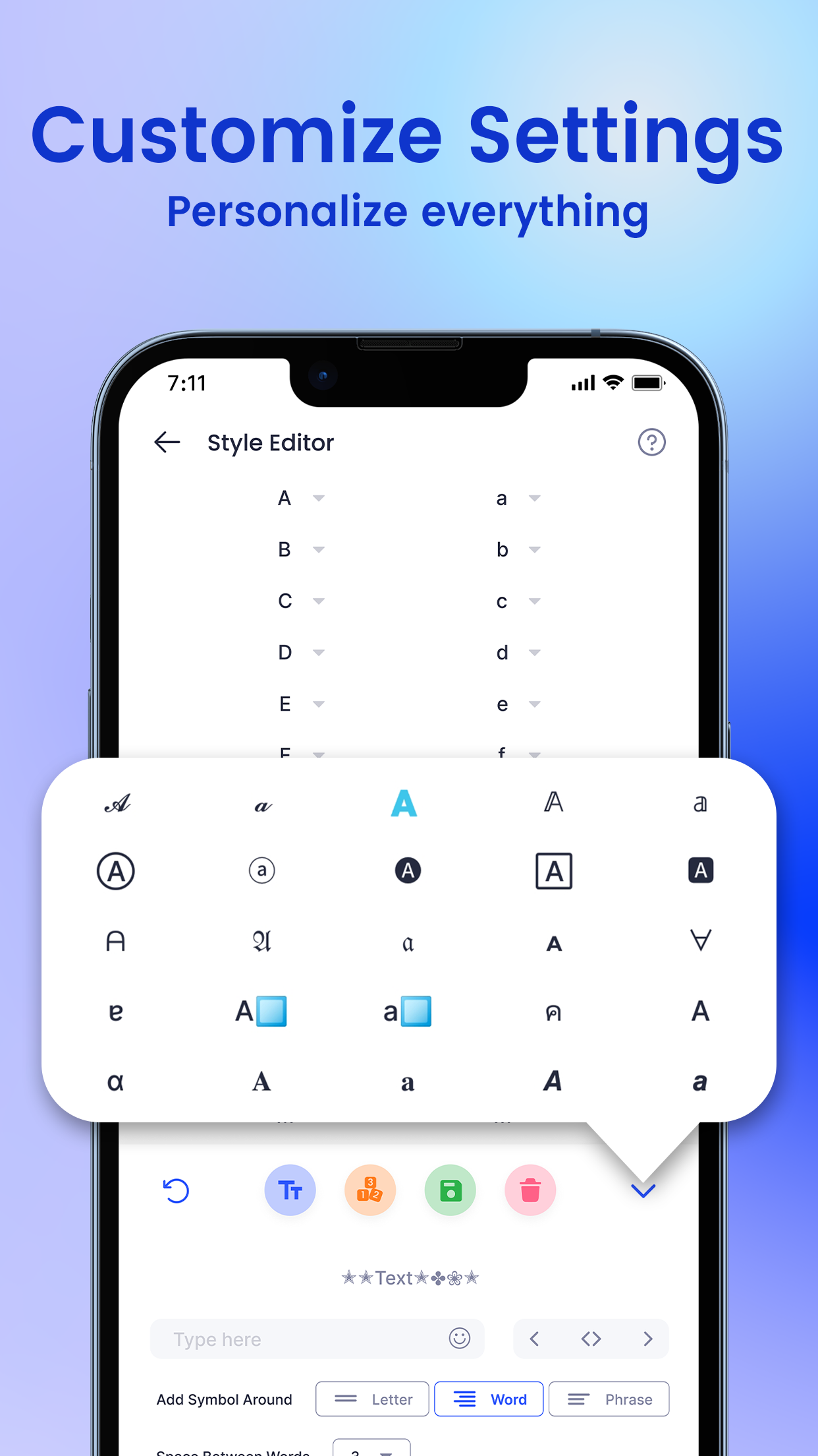 - Innovate new styles or modify existing ones with choices to integrate Symbols or Emojis around letters, swap one letter for another, or adjust the spacing between words for customization.