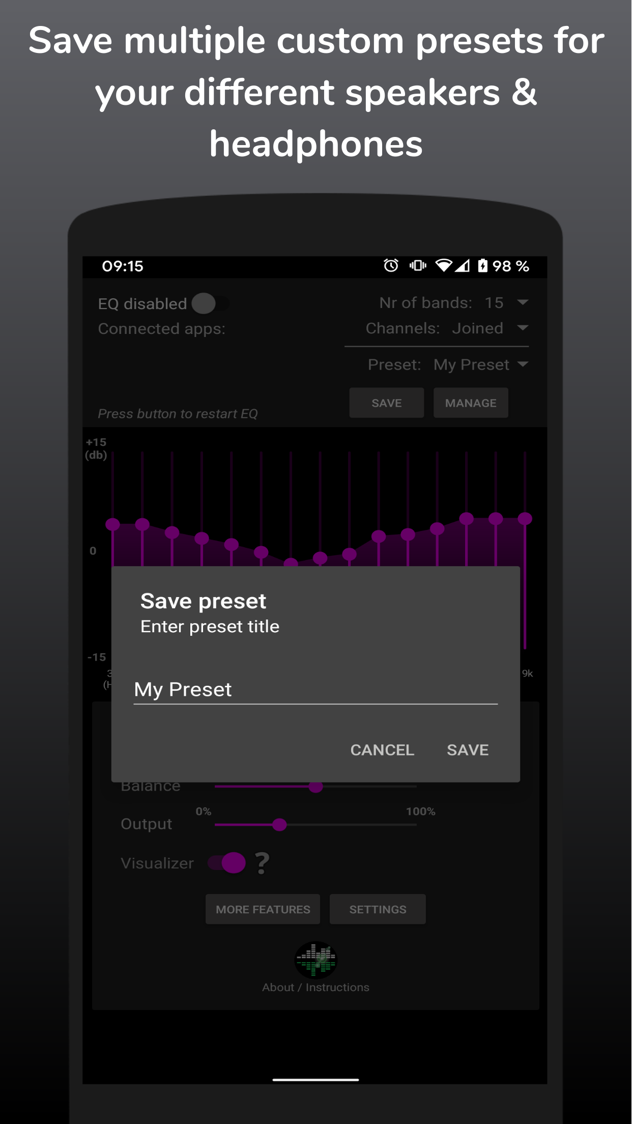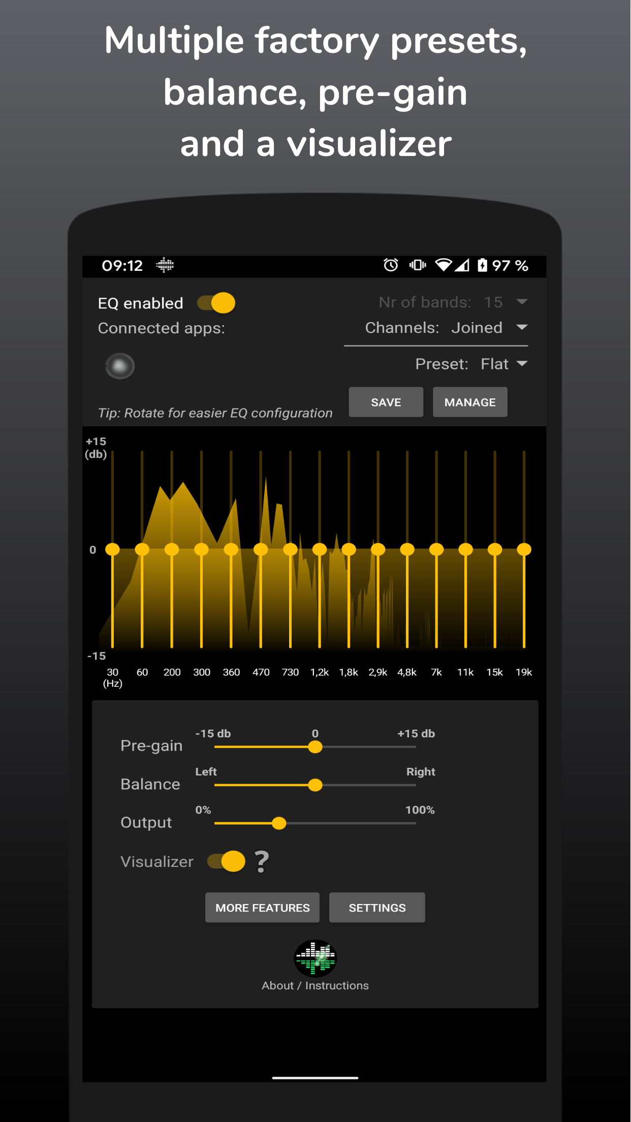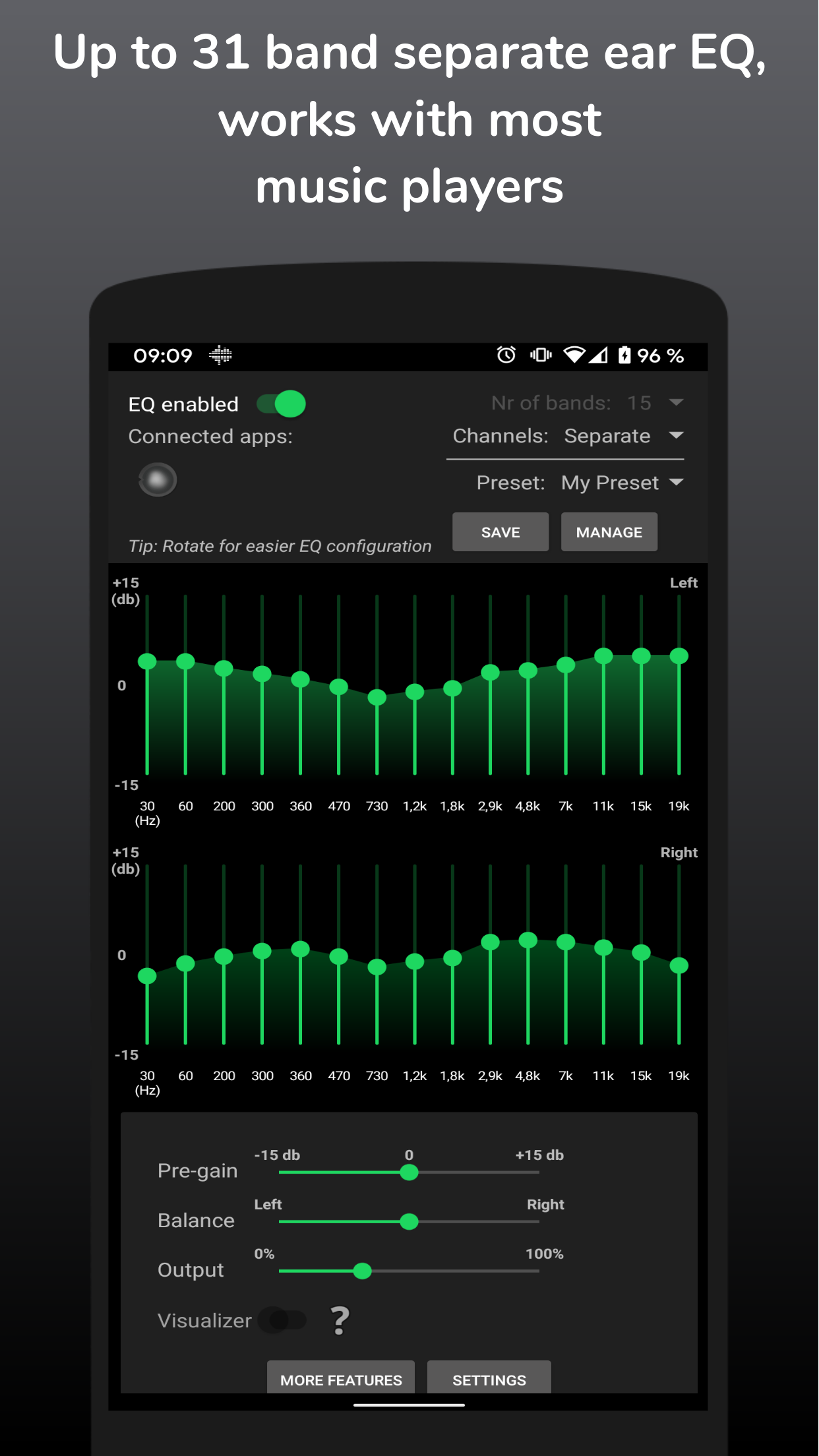 Experience music through your preferred player with high levels of customization enabled by a sophisticated 15 band equalizer, diverse sound presets, and options for balance and pre-gain volume control.