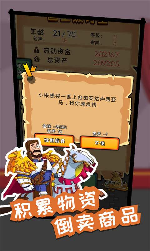 1、在不断的倒卖物品中快速的让角色的社会地位提升,最终成功去面见国完成,完成刺杀。