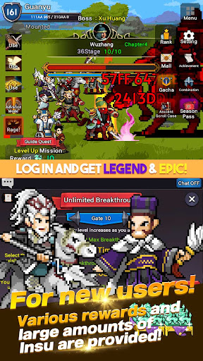 GuanYu Idle is an idle 2D game that features dot characters. The game invites Players to collect over 100 different generals and weapons in the realm of the Three Kingdoms, featuring Wei, Shu, Wu, and Gun. As you collect various generals and treasures, you'll be able to make GuanYu stronger and more powerful.