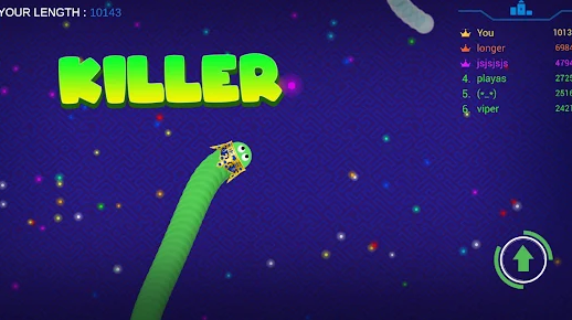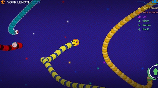 2、Maneuvering Your Worm - Control your own cunning worm and navigate through the maze-like arena, outsmarting your opponents. Grow longer and stronger by consuming colorful pellets and other worms, but beWare of the bigger predators!