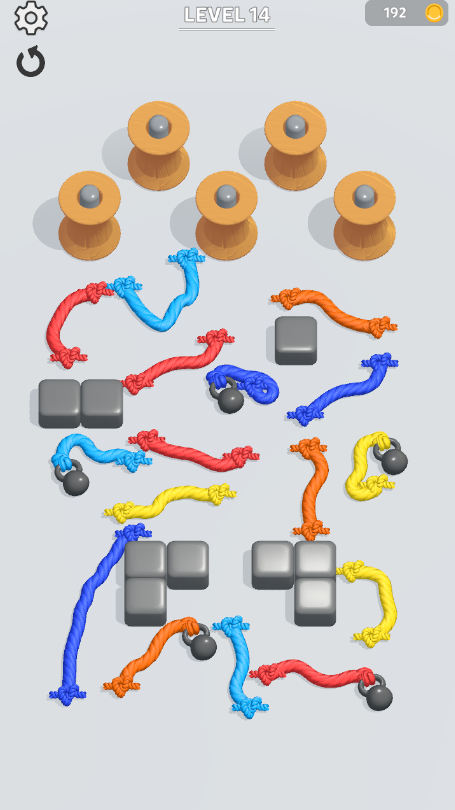 1、As you merge ropes of the same color, you will wind them onto a spool. The goal of the game is to merge all same-colored ropes and wind them onto the spool.
