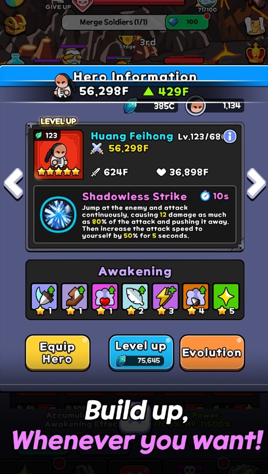1.Idle Rumble Rush boasts an extensive roster of heroes, each with unique abilities and characteristics. Players can strategically Build their team by collecting and upgrading heroes to create powerful combinations. The diverse range of characters adds depth to the gameplay, allowing for varied strategies and team compositions.