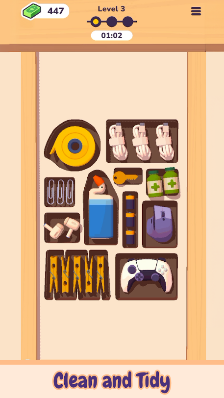 2、Unlock the secrets of meticulous planning: In DrawerSort, players will unlock the secrets of meticulous planning, discovering the best ways to organize their belongings and transform their house into an oasis of orderliness.