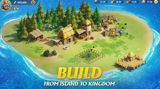 2、Build and Grow: You will need to build a village on the island and command your Farmers to grow crops, gather resources, hunt animals, cut wood, mine ores, and build houses. You start as a small village and grow into a castle and the strongest kingdom upon the land.