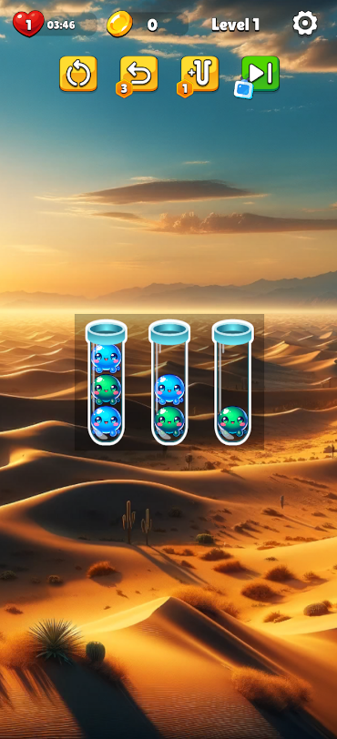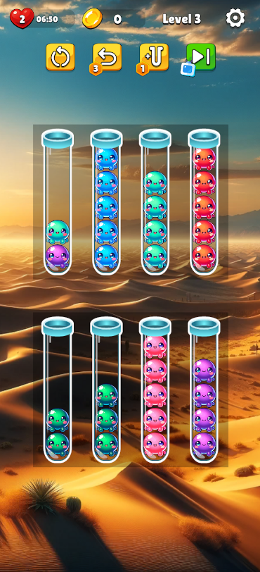 1、Sorting by color: In this game, players must sort colored balls and place them in the corresponding tubes. However, there is a catch: players can only stack cute monsters of the same color on top of each other.