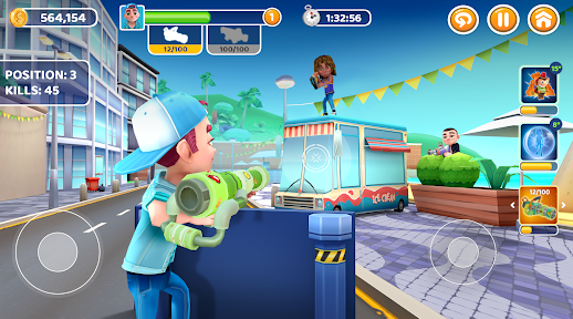 Welcome to PAIntball Rush! Immerse yourself in this exciting Shooting game and explore a variety of crazy scenarios, awesome weapons, and powerful powerups. Face off against challenging opponents while collecting different characters and over 60 customization items to look cool while dominating the Battle Royale against Players from all over the world. Choose from 8 powerful weapons and powers and equip them in different ways to find your perfect match, trying out different deadly combinations to achieve victory.