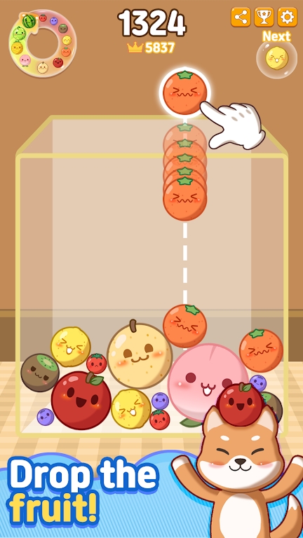 1."PupFruit - Merge Mania" revolves around the concept of merging fruits of the same kind to create larger and more valuable fruits. As players drop fruits randomly into a box, their goal is to strategically merge fruits to earn higher scores. The more fruits merged, the larger the fruits become, bringing higher point Rewards. However, players must be cautious not to let the fruits cross the upper line of the box, as this results in defeat.