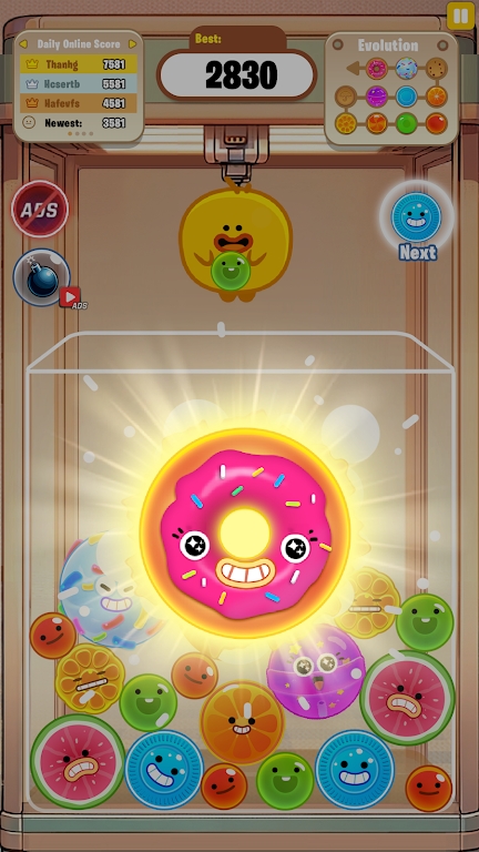 1.The game features a straightforward gameplay concept. Players are required to tap the screen to choose where they want to drop the candy. By merging two identical candies, players can create a new, bigger candy. The objective is to create as many combos as possible by strategically merging candies. This simple yet challenging mechanic keeps players engaged and motivated to progress further.