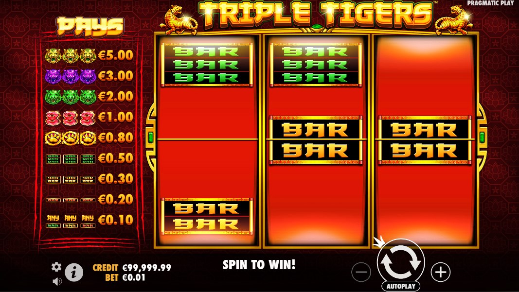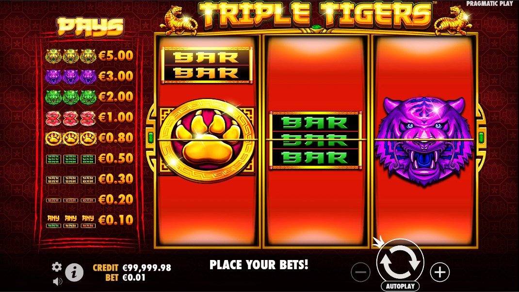 2.No Wilds or SCatters: Unlike many modern slot games, Triple Tigers does not feature wild symbols, scatters, or free spins, focusing instead on the simplicity of traditional slot machine gameplay.
