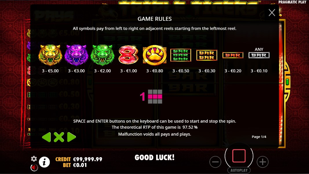 1.Traditional Gameplay: Triple Tigers sticks to the classic slot machine format with three reels and one payline, making it easy to understand and play for both new and experienced players.