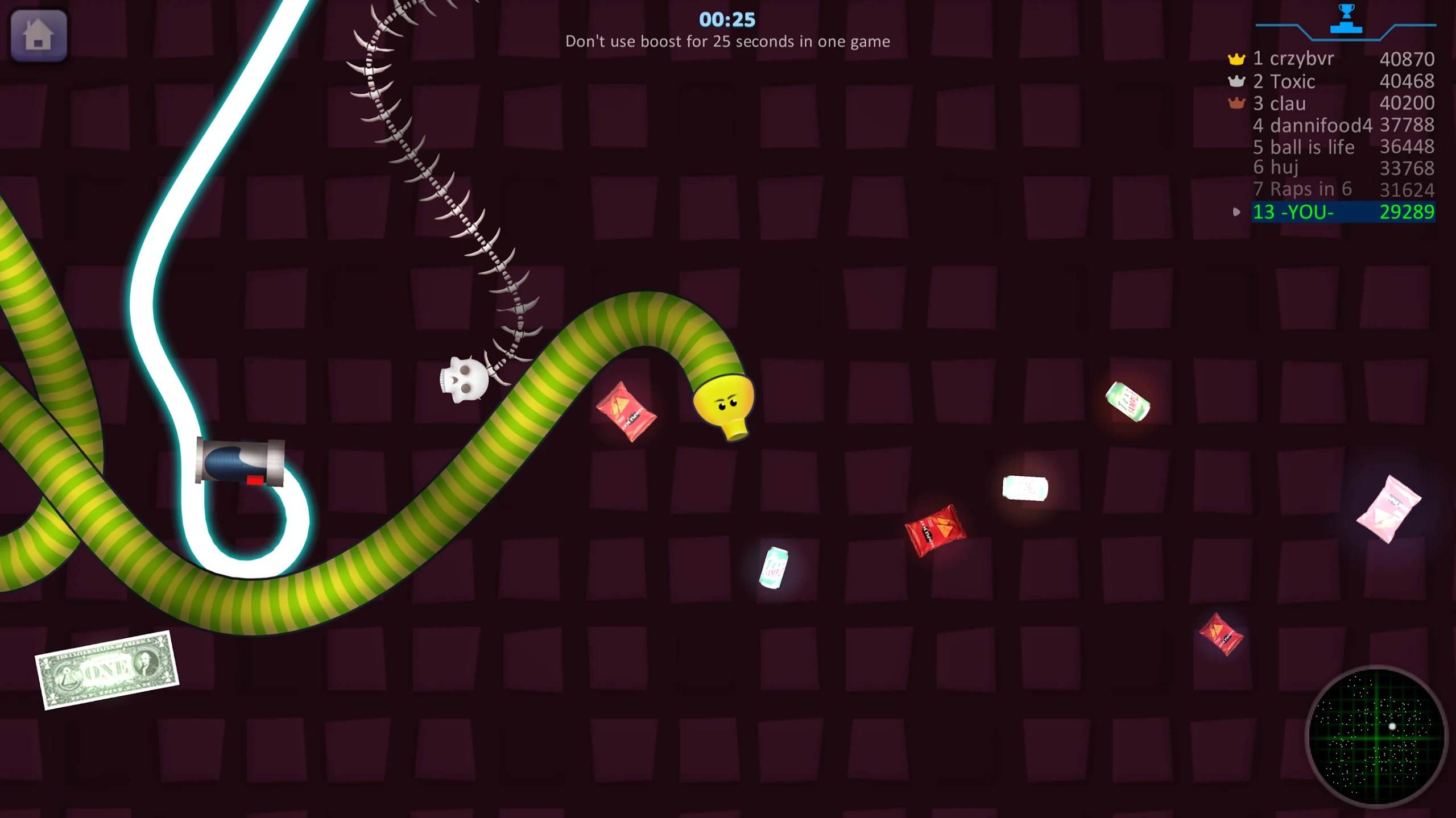 Upon colliding with your body, opponents leave behind a trail of cash which can be consumed to further enlarge your worm!