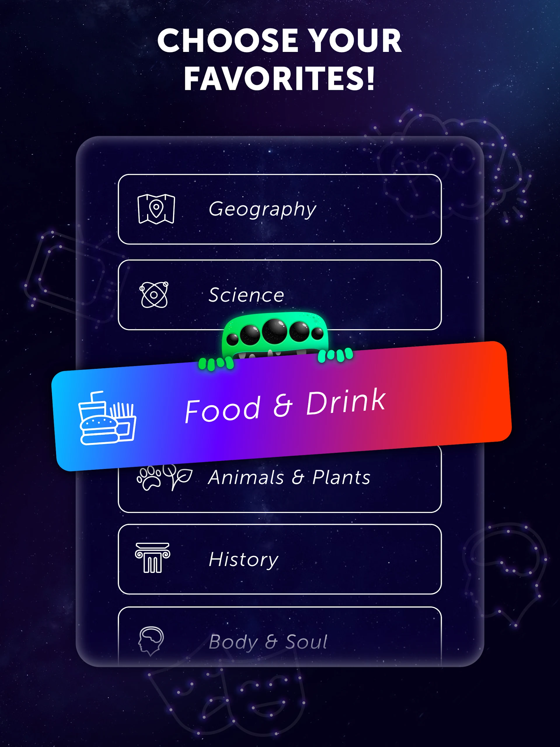 Select from an array of 19 captivating topics, such as Geography, HiStory, Science, Animals & Plants, Food & Drink, and many others. No matter if you are deeply passionate about history, have a knack for science, or possess a love for pop culture, there’s definitely a Category tAilored for your interests and tastes to explore.