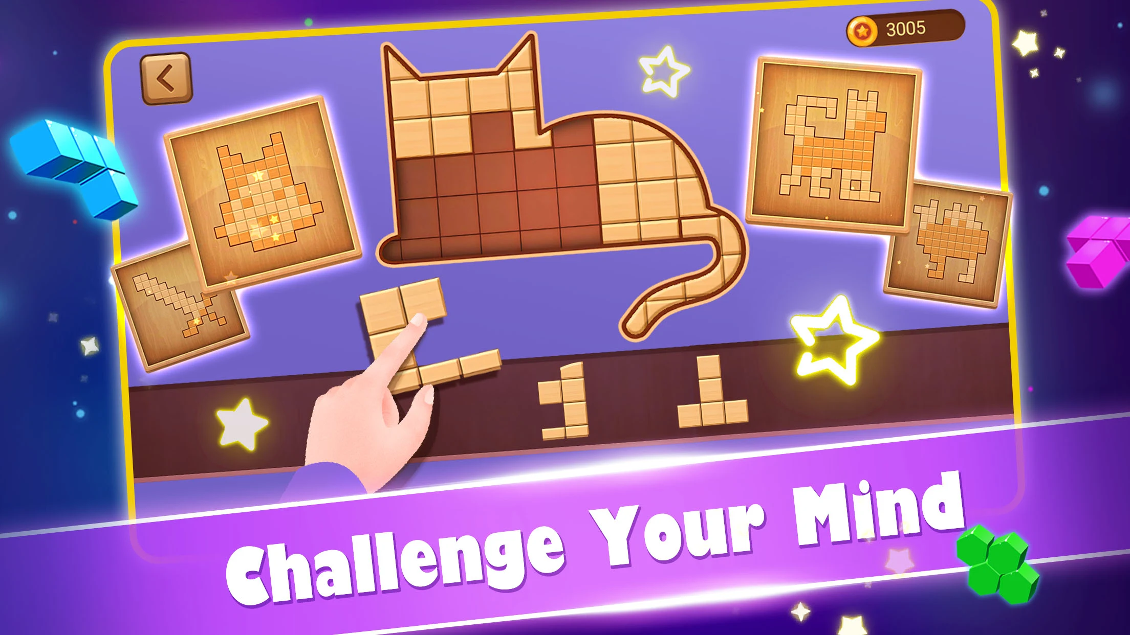 Immerse yourself in a beautifully Crafted Wood Block Puzzle interface that exudes retro game charm.