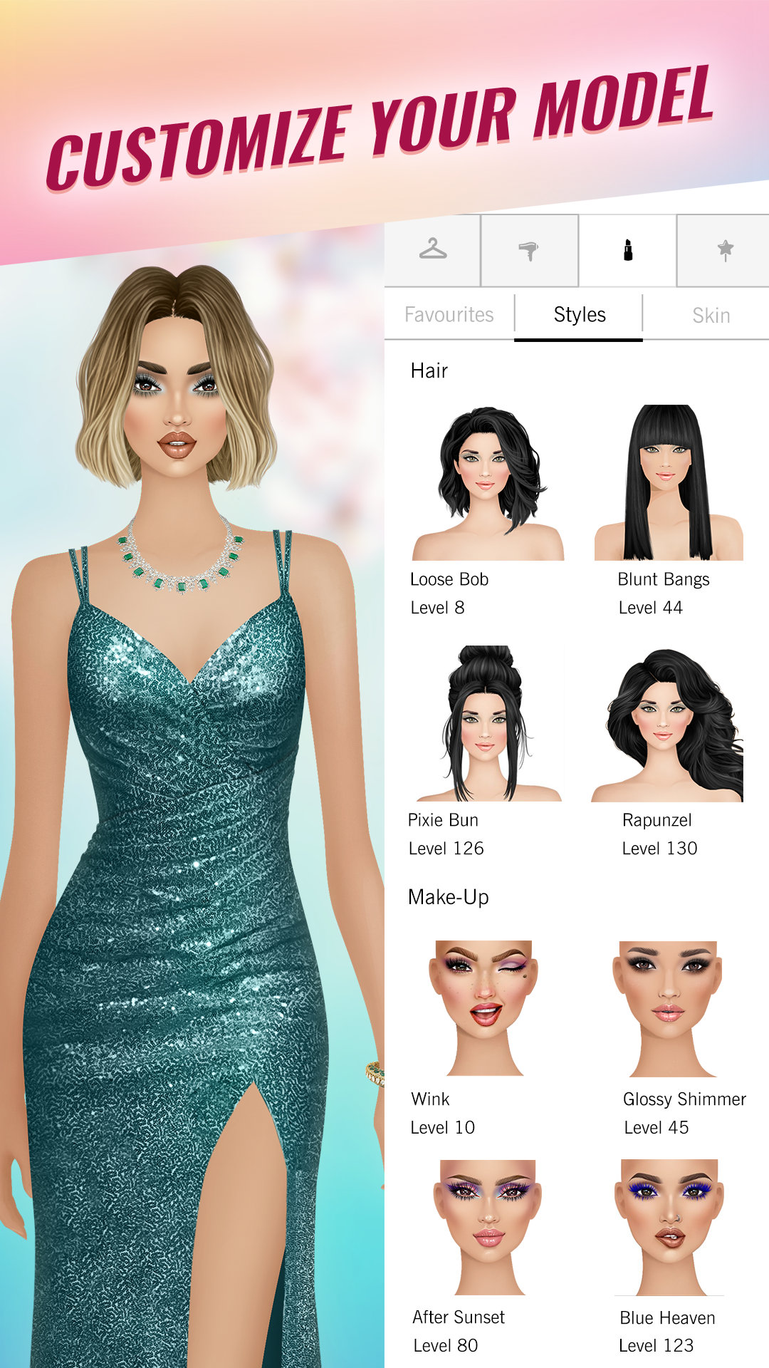 CREATE THE IDEAL LOOK. Choose from thousands of glamorous garments and accessories, alongside hairstyles and makeup options, to craft outfits for different style challenges including photoshoots, cocktail parties, and red carpets.