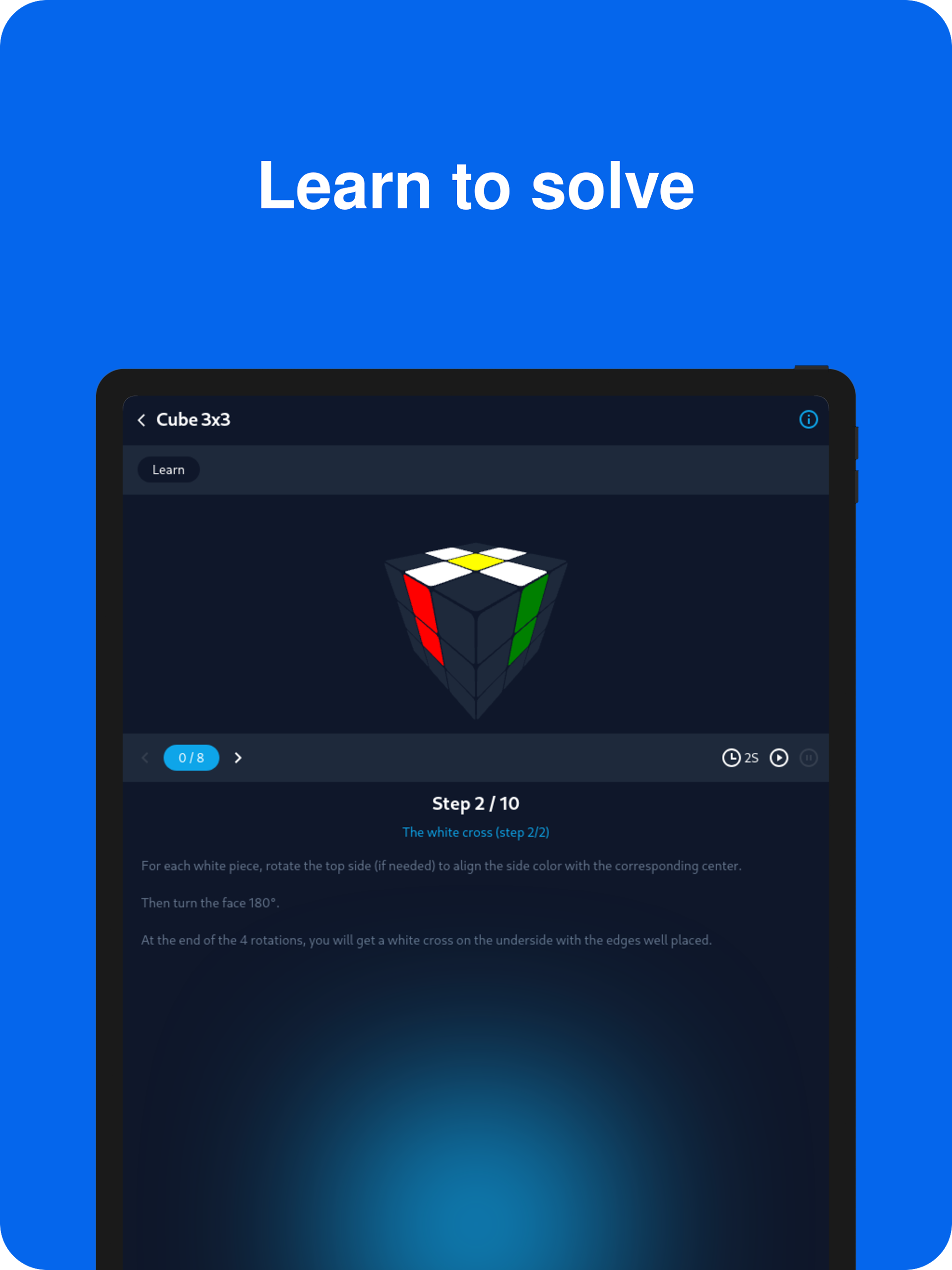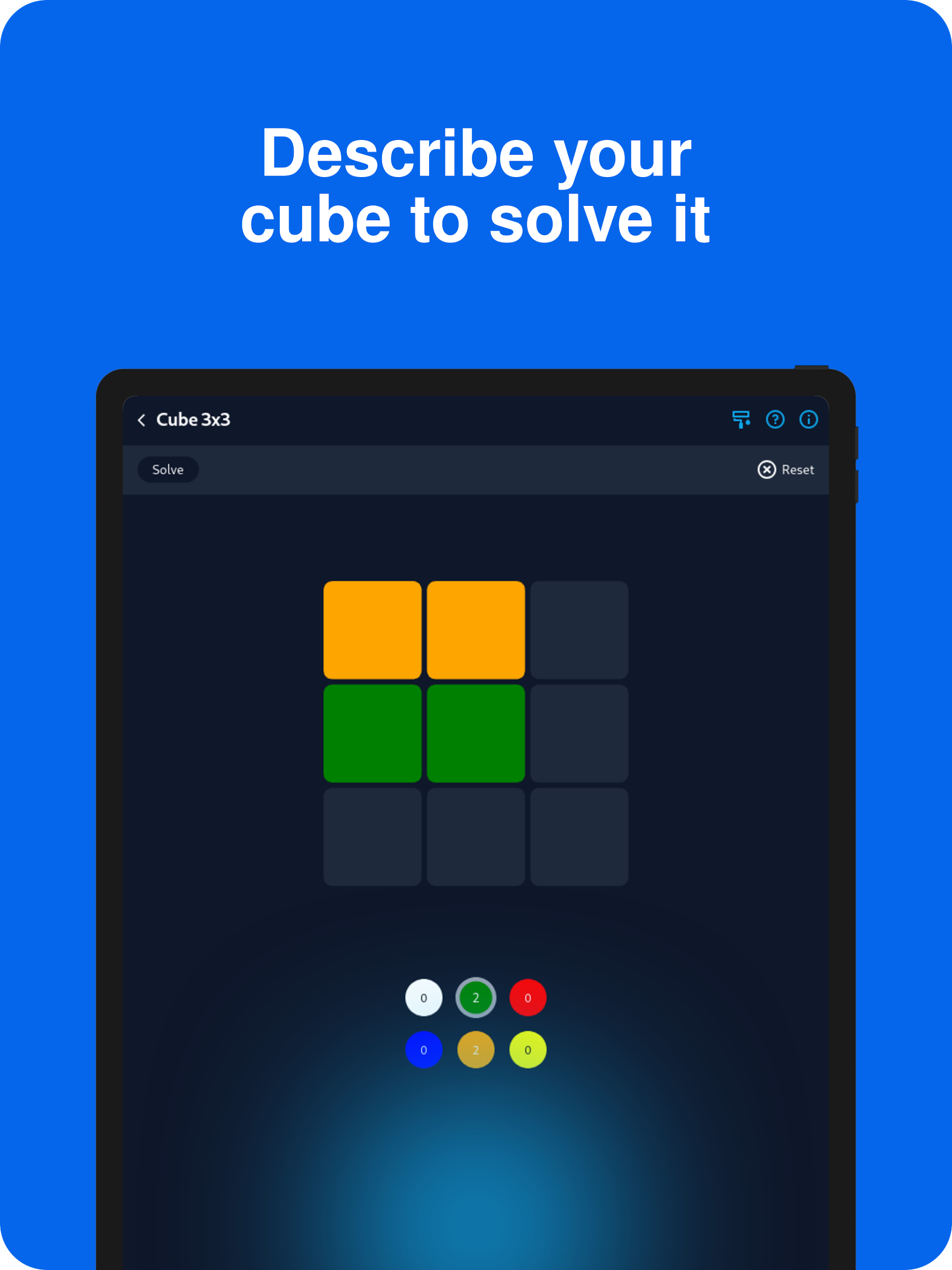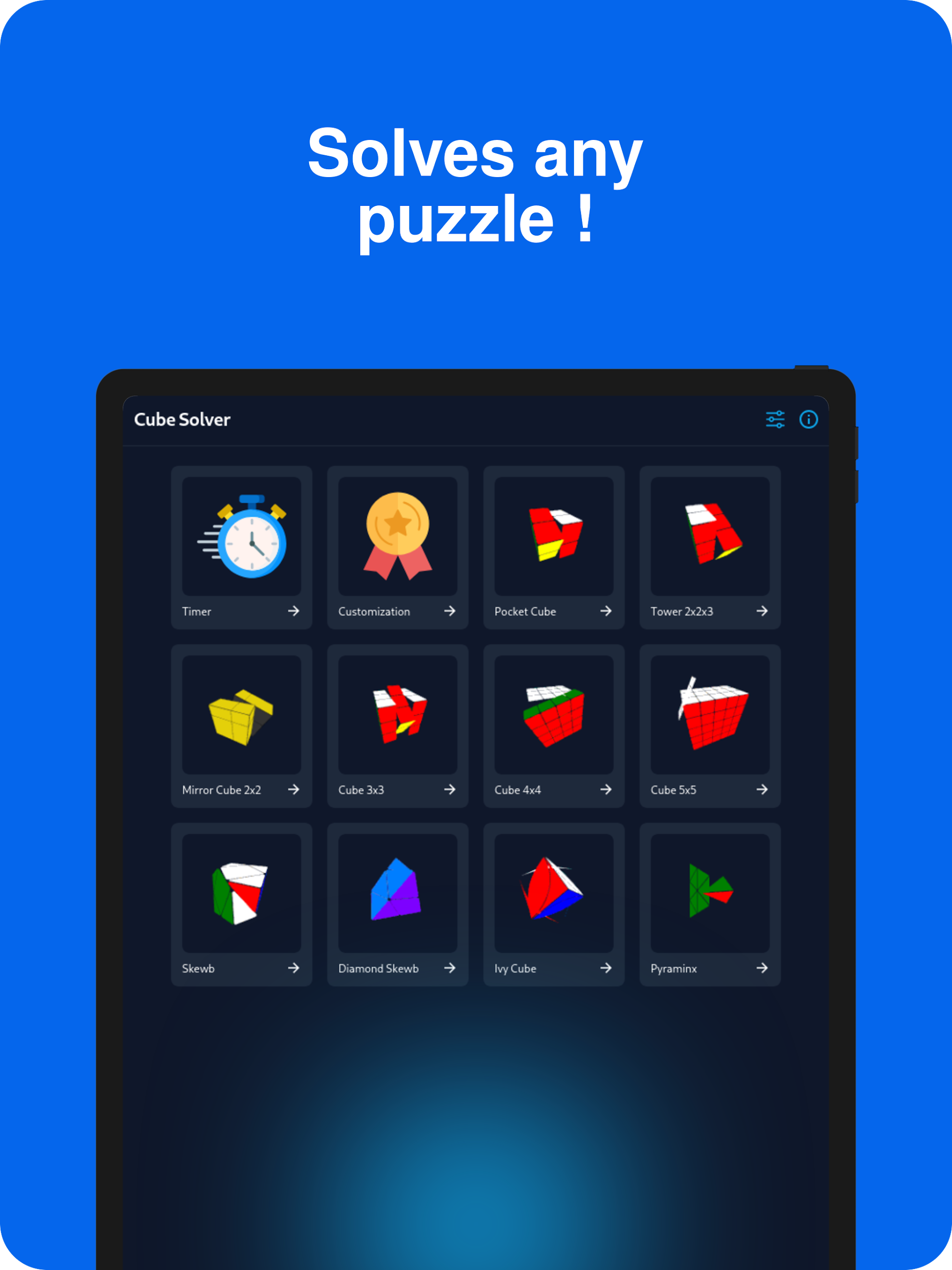 - Cube 3x3: solves the classic 3x3 cube with an average solution of 27 moves.