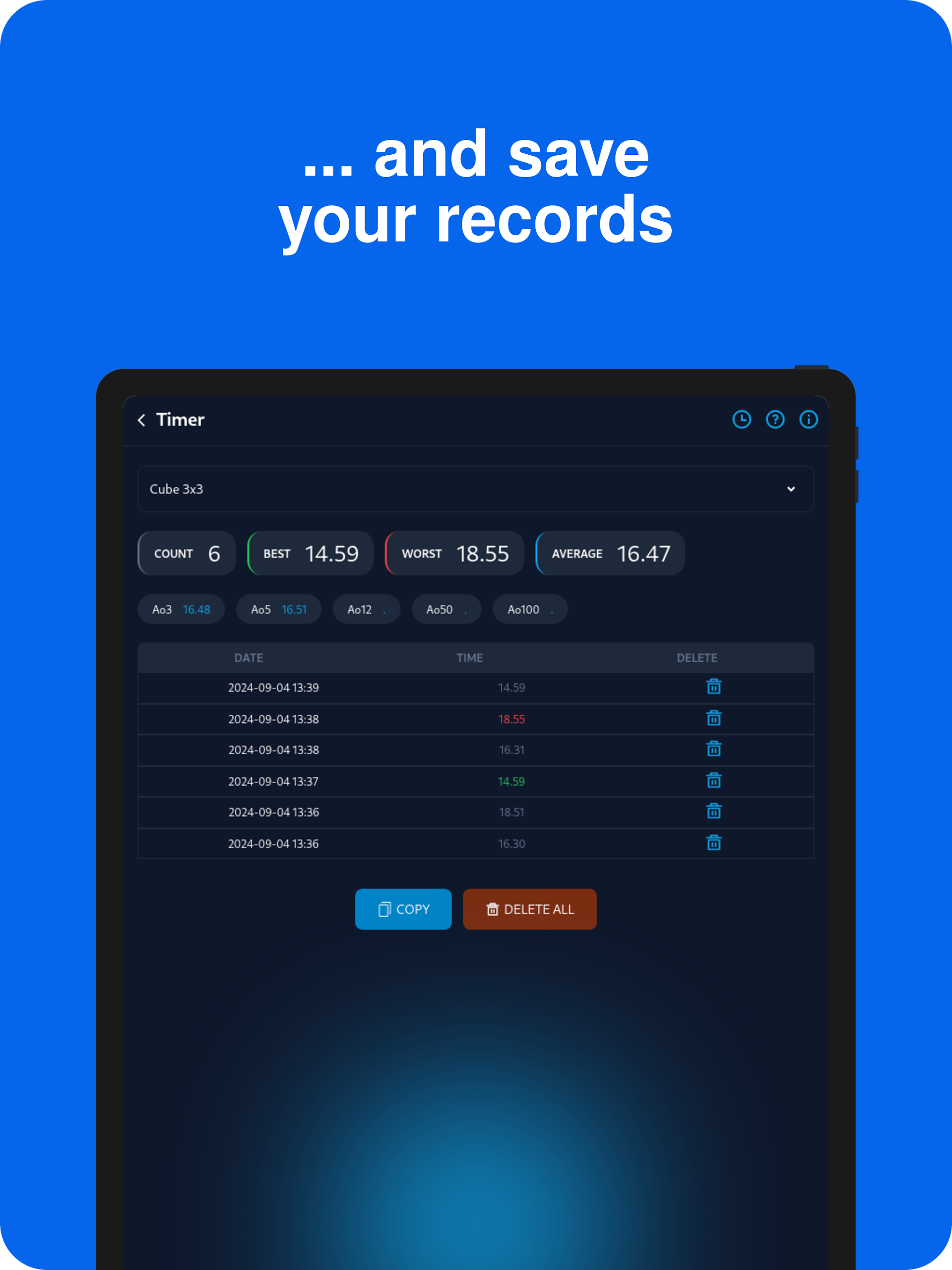 Enhance your skills by practicing quick puzzle solving with random shuffling accompanied by a timer that provides detailed statistics (SpeedCubing).