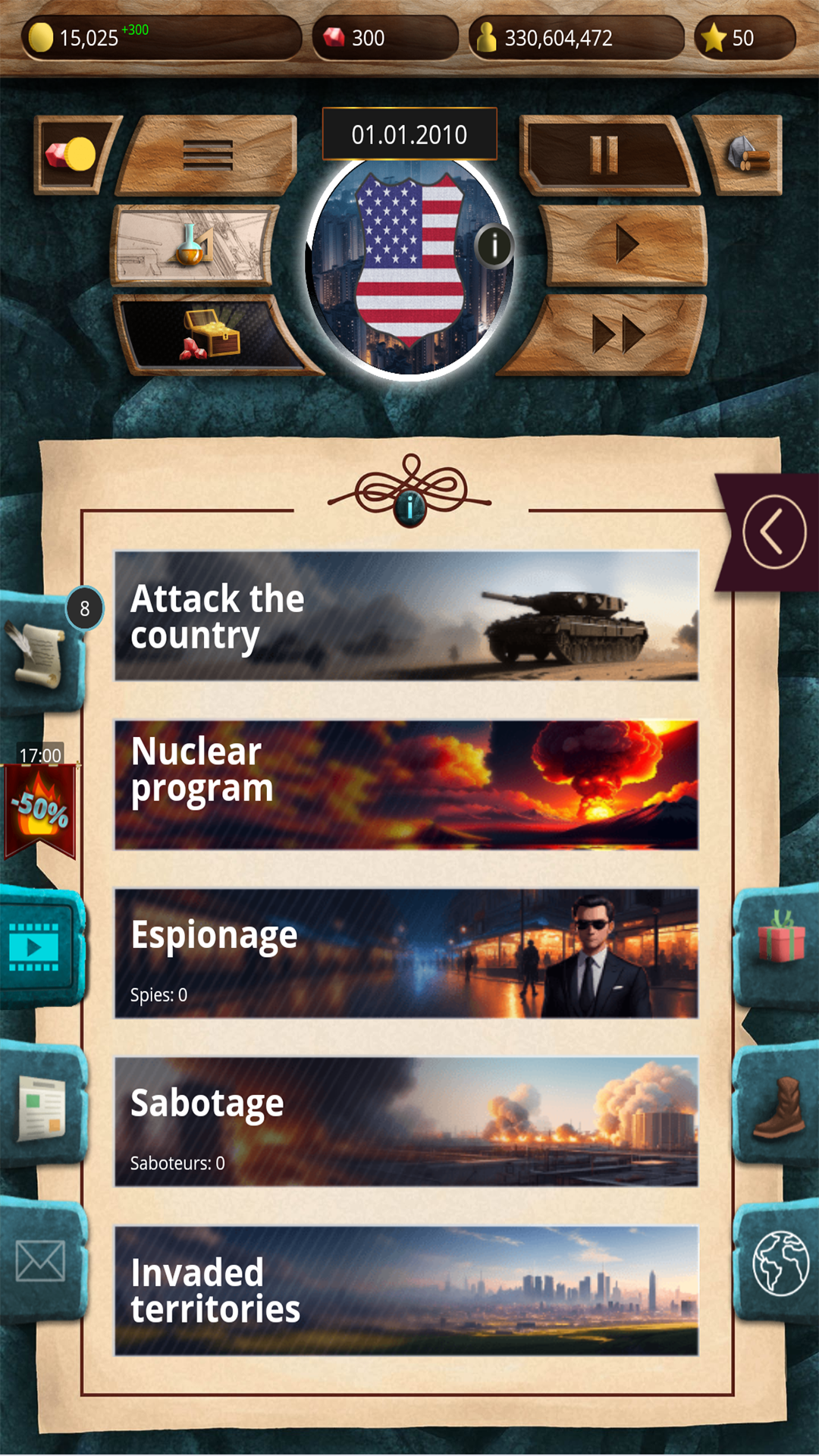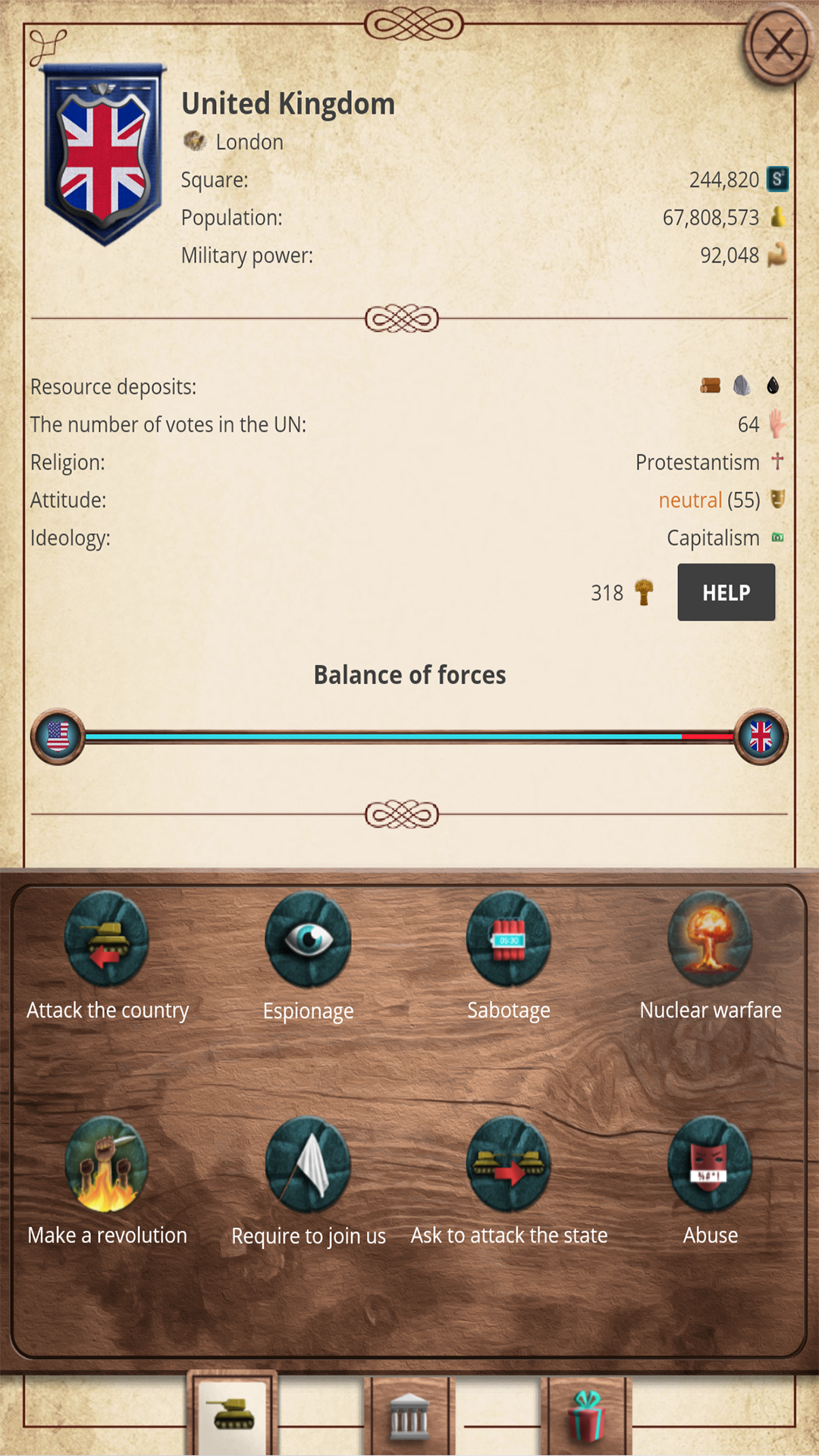 Modern Age stands out as an exemplary choice for enthusiasts of battle and strategy genre games, placing you in the role of a president of any contemporary nation. Here, you'll oversee its Military, economy, and assorted aspects, with numerous gameplay options ensuring a rich experience. Beyond managing ministries and military forces, players can utilize a war system to gather resources from their armed forces or sell gear, and even purchase military supplies to fulfill their objectives. With comprehensive powers, players craft laws autonomously, forge international treaties through the United Nations, and generate resources to elevate citizen welfare. Accessible on any digital device, this game appeals broadly to strategy aficionados—consider giving it a shot!